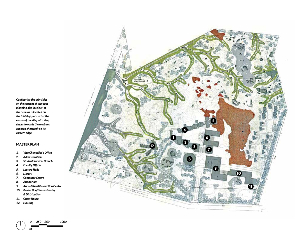With the use of well-distributed urban elements as well as a landscape design articulating the natural elements – land, vegetation, rocks, and water – the proposal strives to develop as an exemplary institutional model that brings to board multidisciplinary learning while designing in harmony with nature.