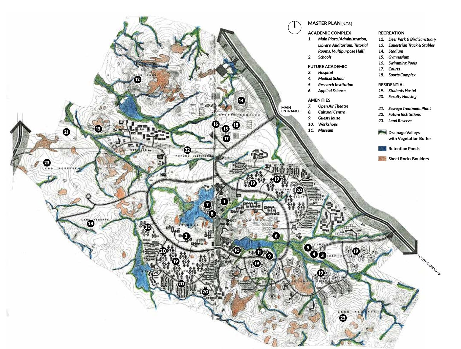 The project attempts to offer a ‘grounded’ expression to the development, at a conceptual level, while and providing a model of interrelated cluster planning for large- scale institutions that is informal in outlook, flexible in functioning, and environmentally sensitive.