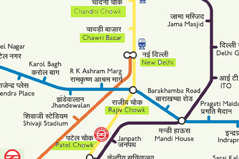 DELHI MAIN RAILWAY STATION, CHAWRI BAZAAR, NEW DELHI RAILWAY STATION, CONNAUGHT PLACE, PATEL CHOWK AND CENTRAL SECRETARIAT.